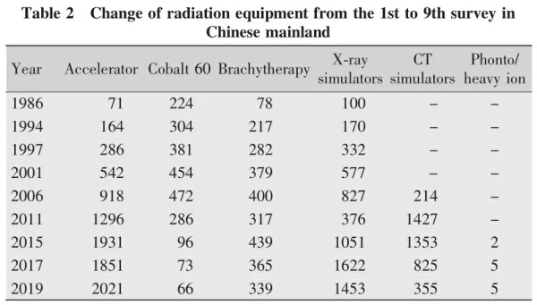 本次調(diào)查顯示中國大陸地區(qū)放療設(shè)備數(shù)量持續(xù)增長,共有直線加速器2,021臺(含進口和國產(chǎn)),鈷60遠距離治療機66臺,近距離治療機339臺,質(zhì)子、重離子機5臺,常規(guī)模擬機1,453臺,CT模擬機355臺。能開展二維放療1,002家,詳見表2(Table 2)。
